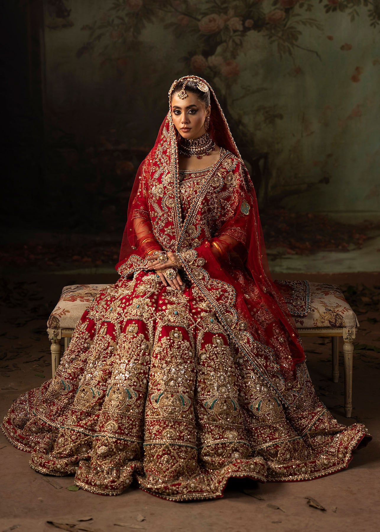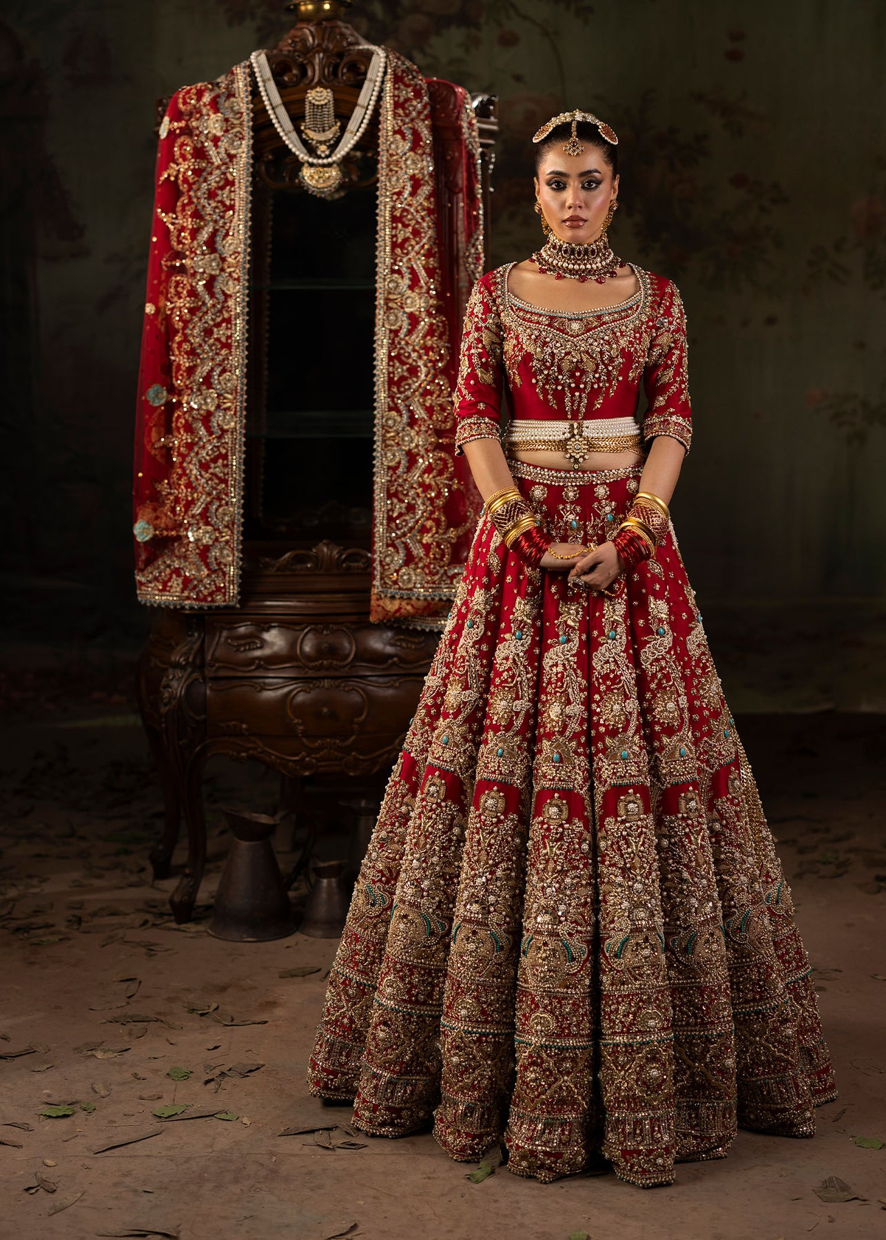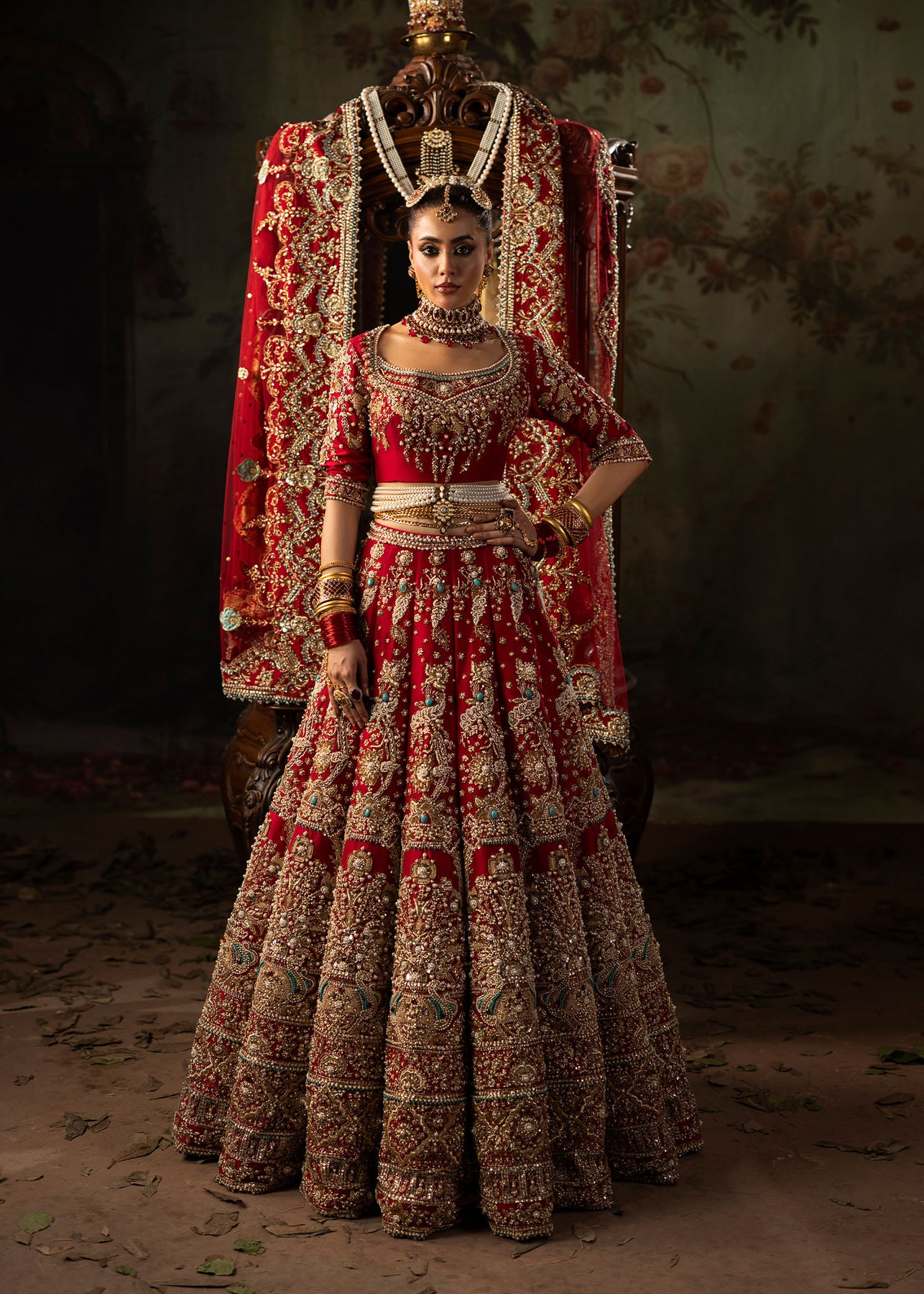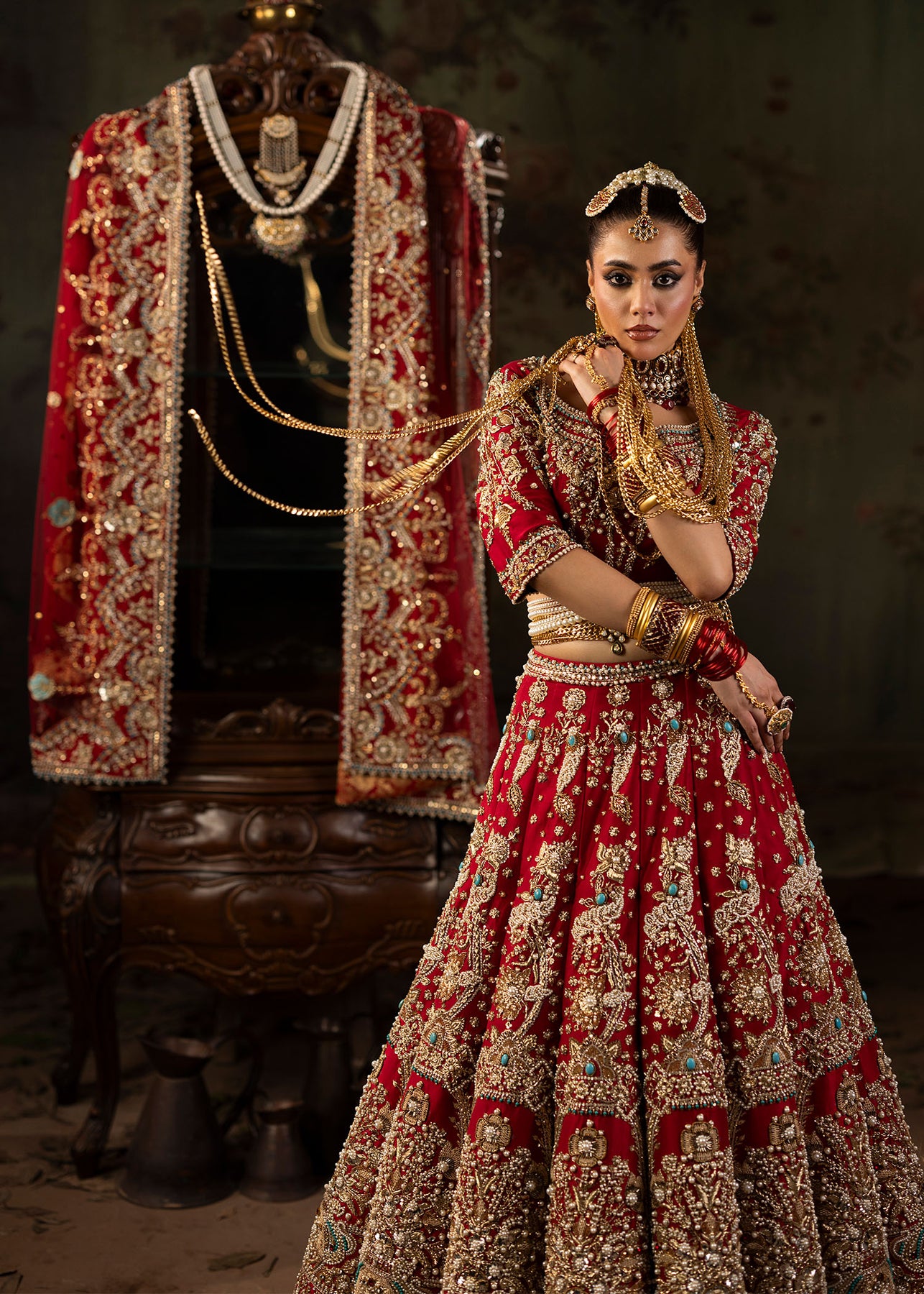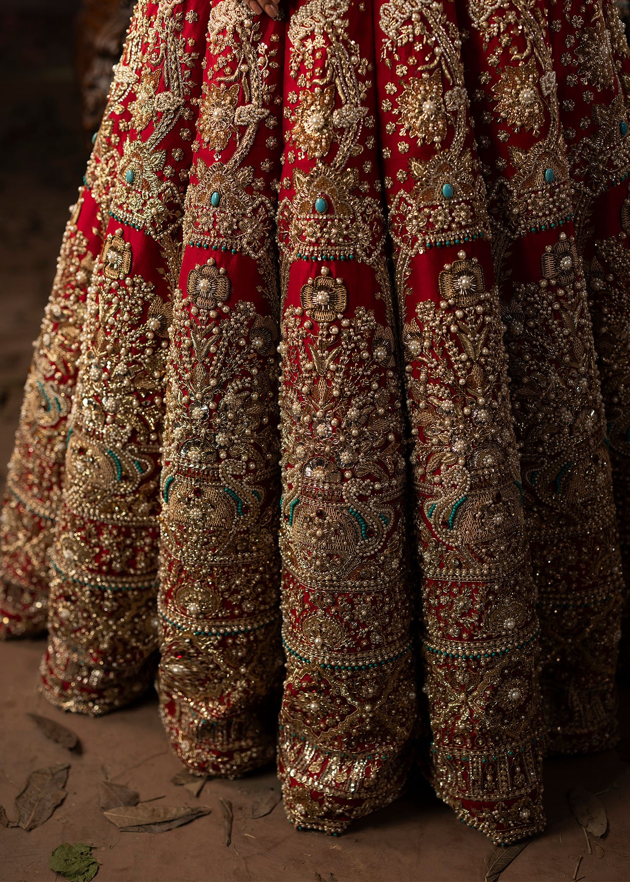A pure raw silk base in ruby red serves as a canvas to shimmery gold and silver hand embellishments. This lehanga and choli is incrusted with naqshi, dabka, resham, sequins and pearls. It is paired up with an exquisite net dupatta with mukaish work and hand embellishments.