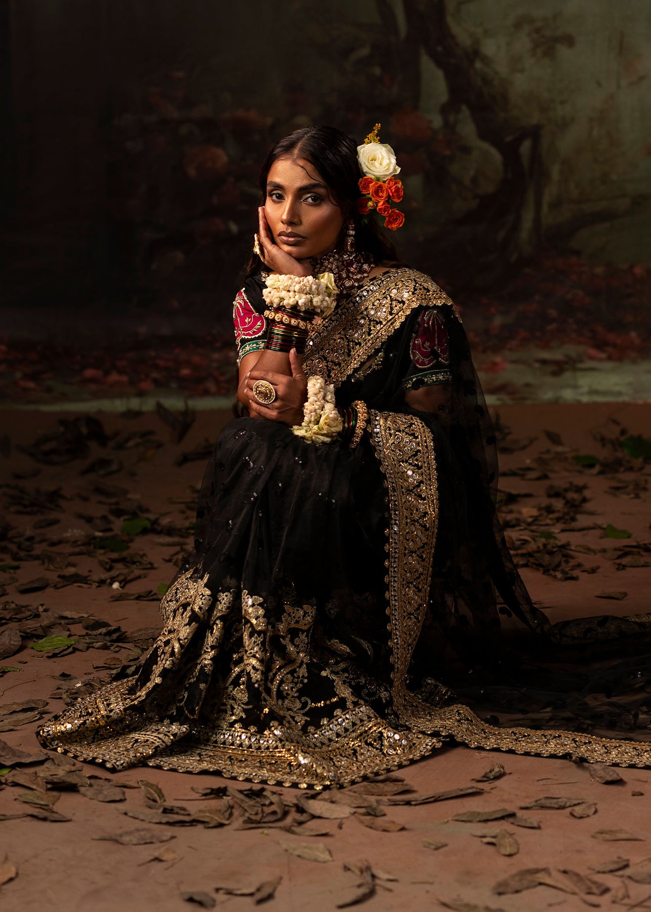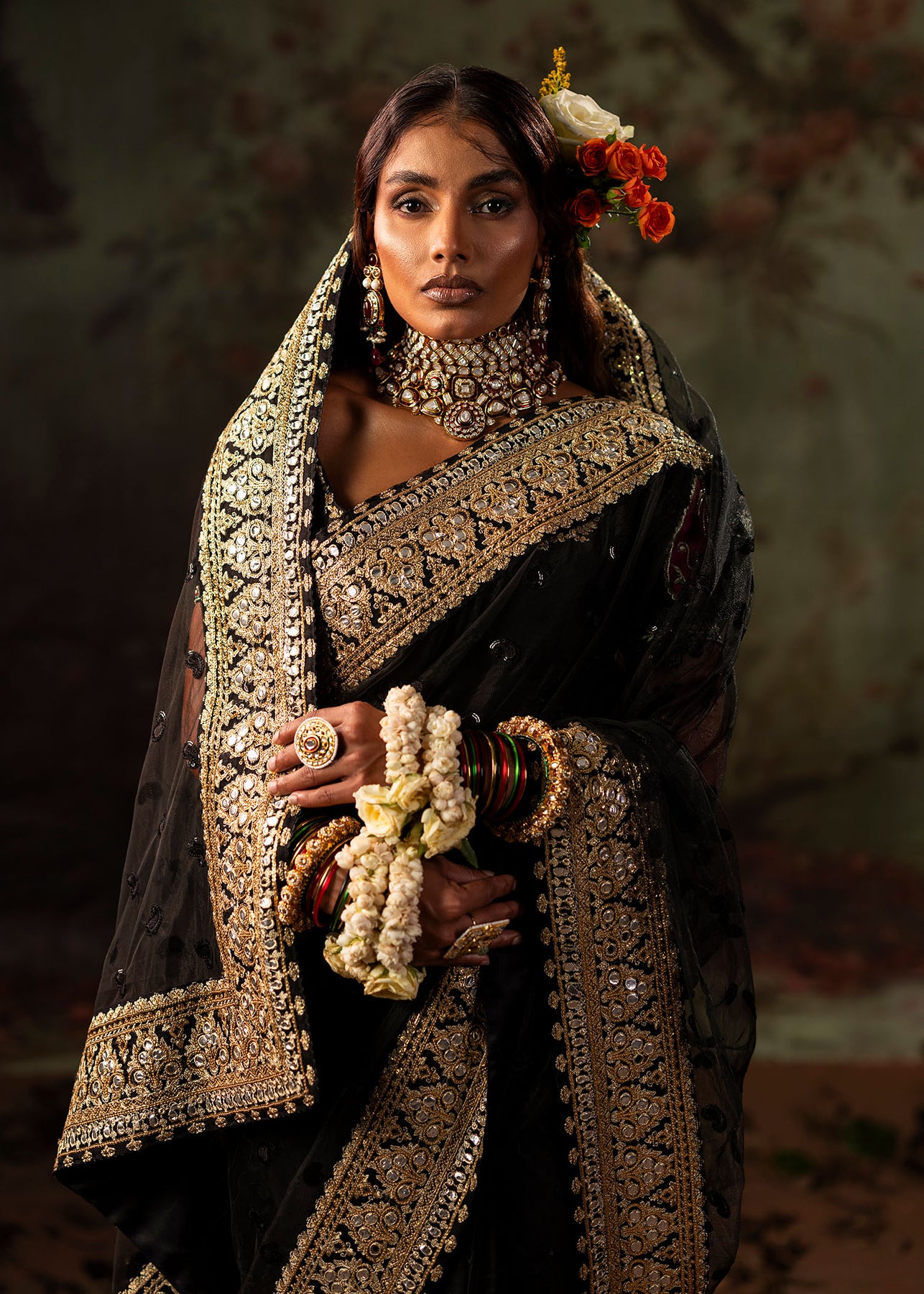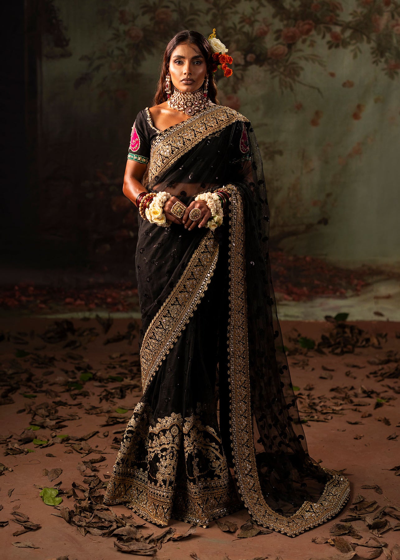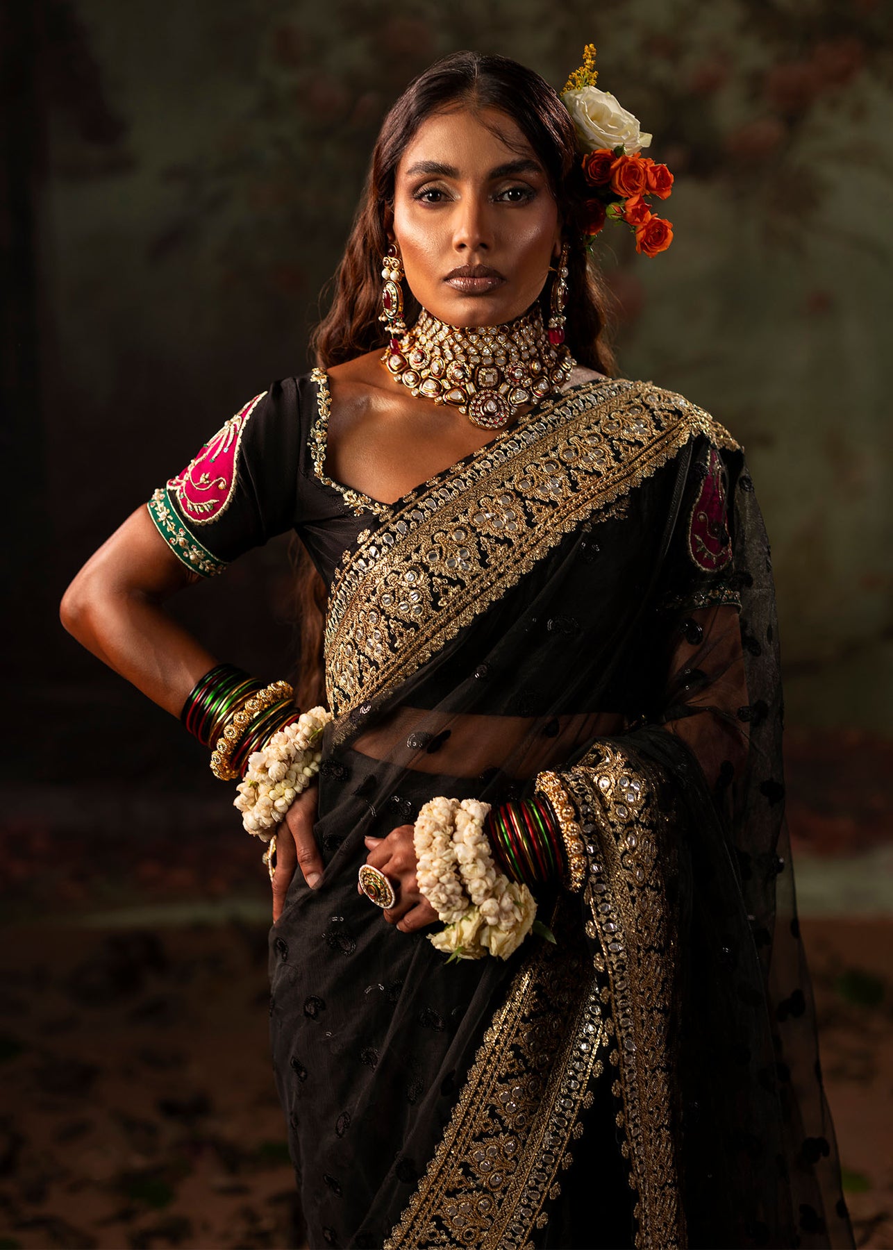 A sheer self embroidered black net saree that gives a dramatic and elegant base. The border consists of Handcrafted panni work in silver and gold, adding a rich shimmer to the edges without overpowering the dark net. Along with that it has a solid black blouse with a statement touch: appliqué and embroidery in green and pink on the sleeves, highlighted further with pearls for a regal, feminine detail.