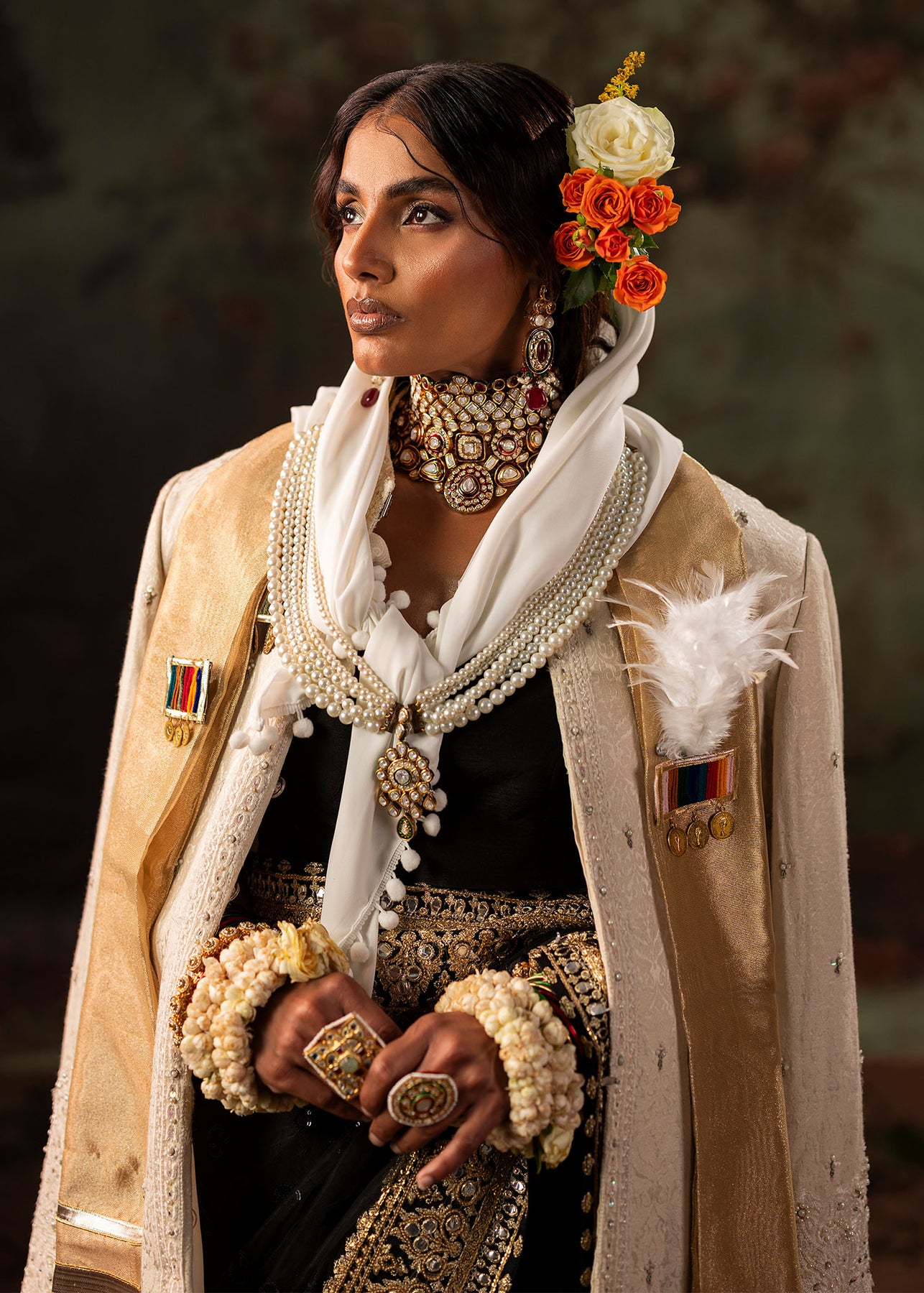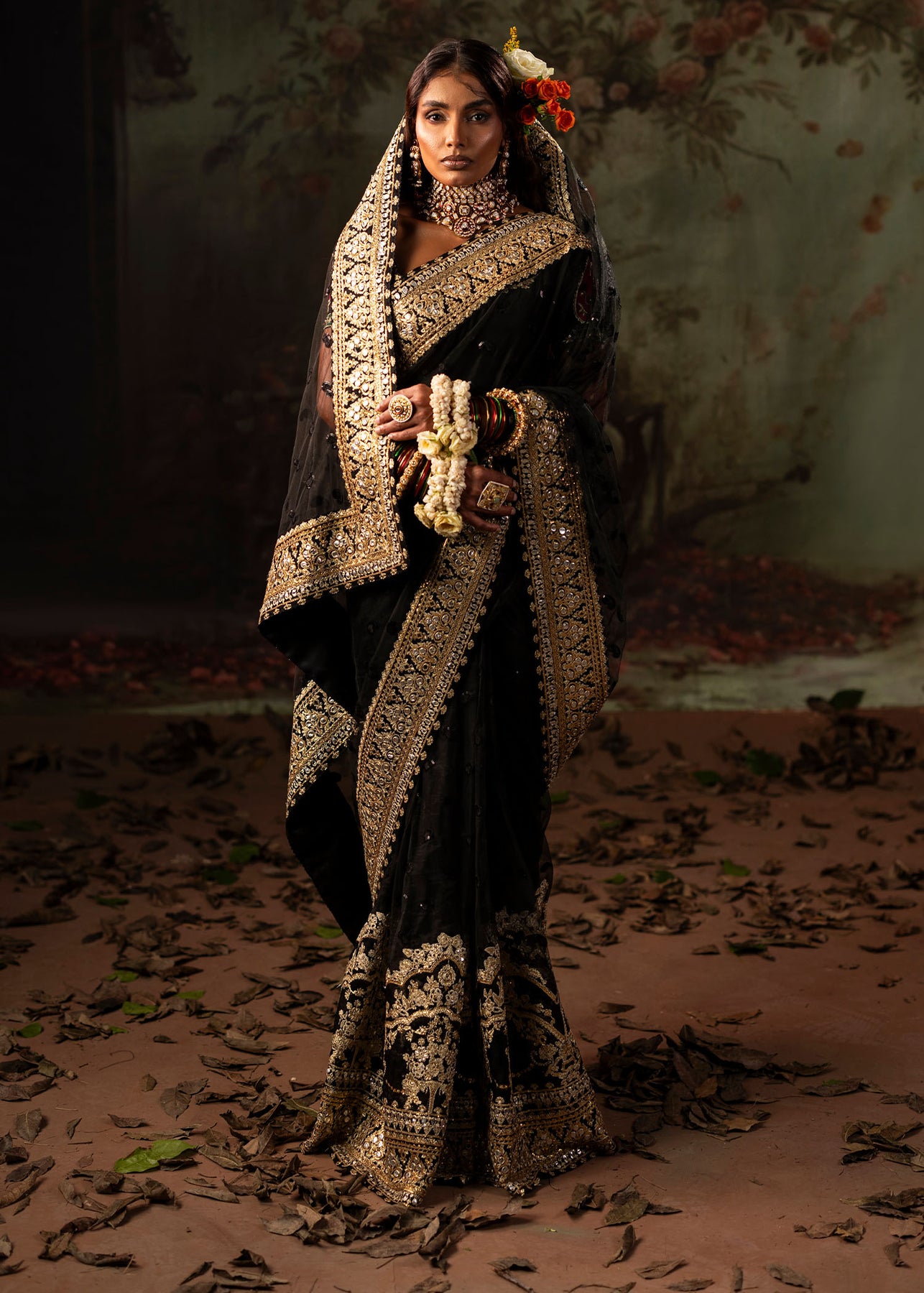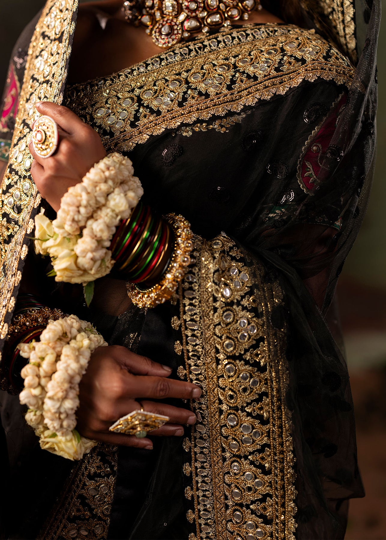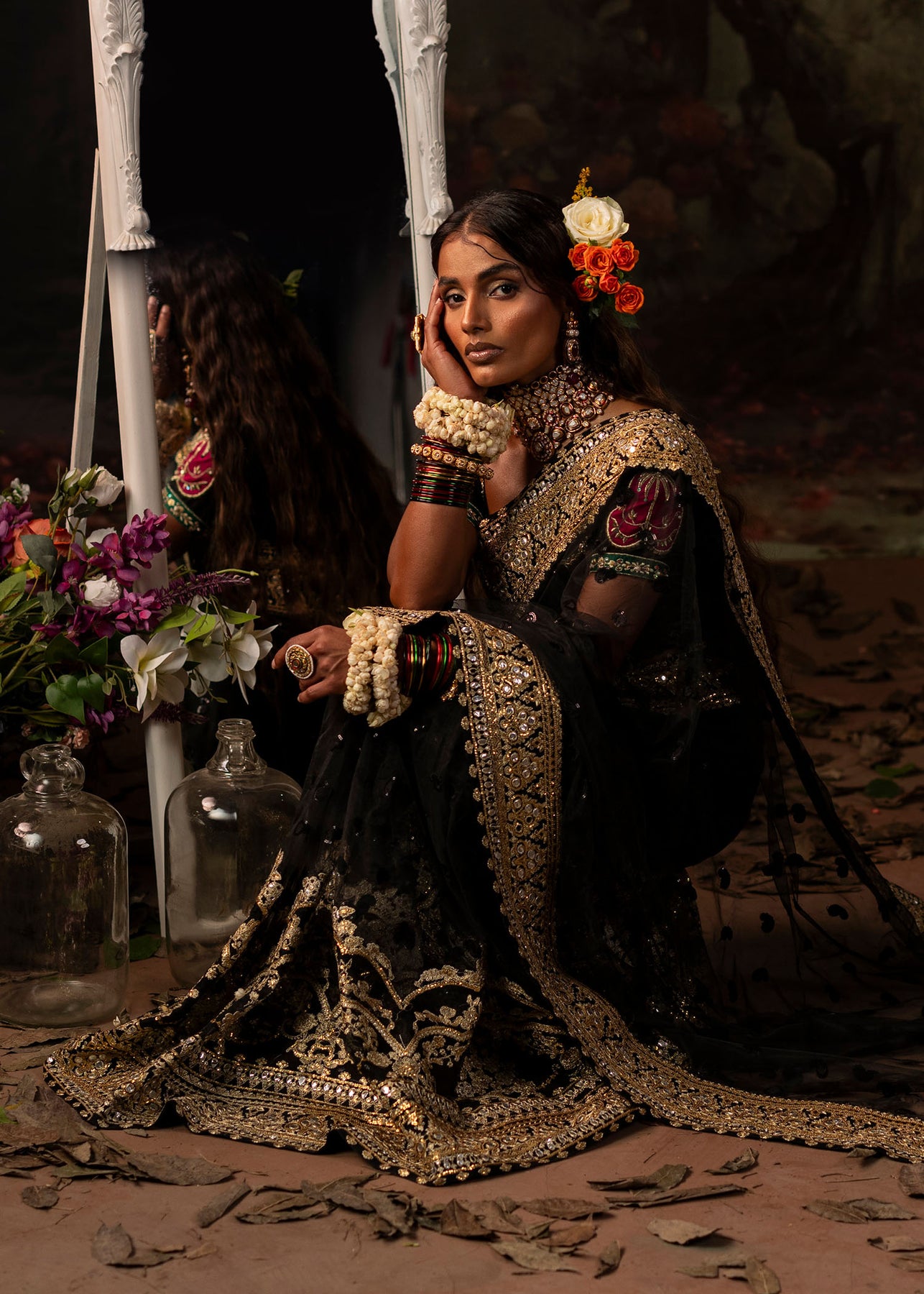 A sheer self embroidered black net saree that gives a dramatic and elegant base. The border consists of Handcrafted panni work in silver and gold, adding a rich shimmer to the edges without overpowering the dark net. Along with that it has a solid black blouse with a statement touch: appliqué and embroidery in green and pink on the sleeves, highlighted further with pearls for a regal, feminine detail.
