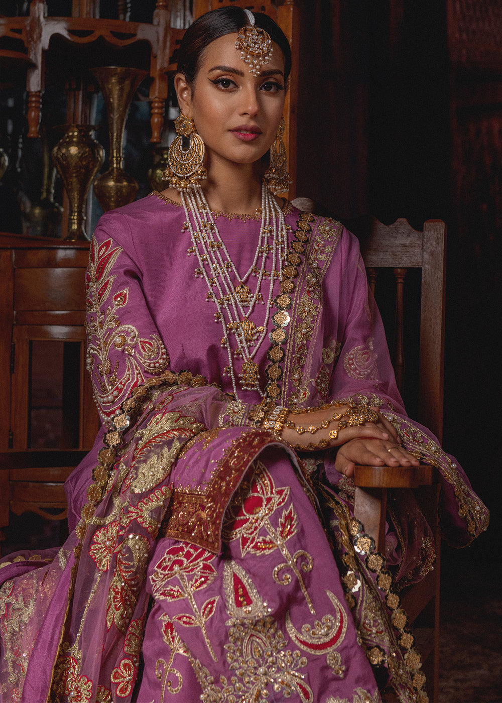 Pure raw silk in dusty pink. Banarsi border on shirt enhanced with shiny gold sequins, naqshi and dabka. Shirt front and back embellished with gold sequins, naqshi and dabka and stones. Pink wool thread used as accent. Appliqué work on sleeves. Machine embroidered Zari work on shalwar with appliqué work enhanced with gold naqshi, dabka, pearls and stones.Pure net dupatta fully embellished with pink wool &, zari thread enhanced with naqshi, dabka, sequins, pearls and stones, finished with beautiful gold lace