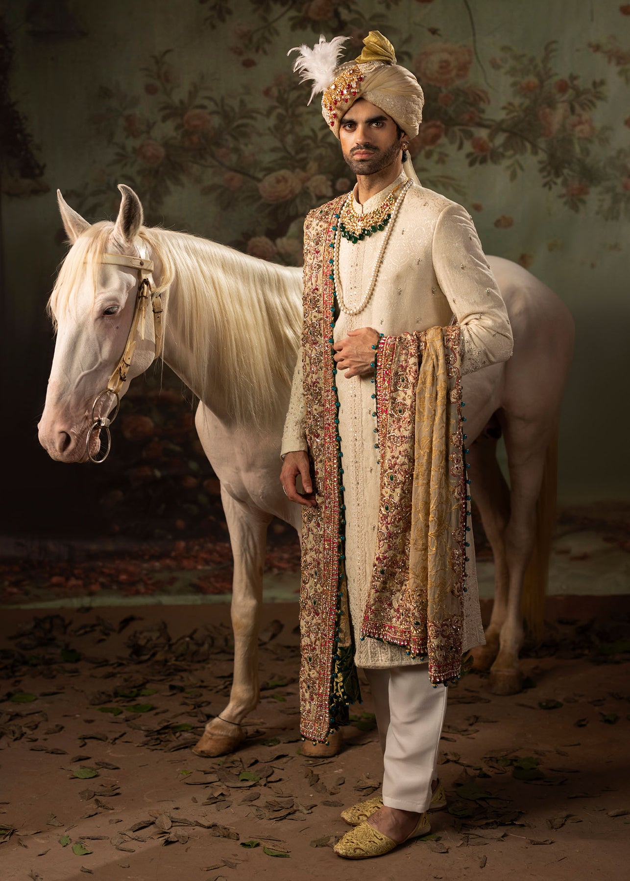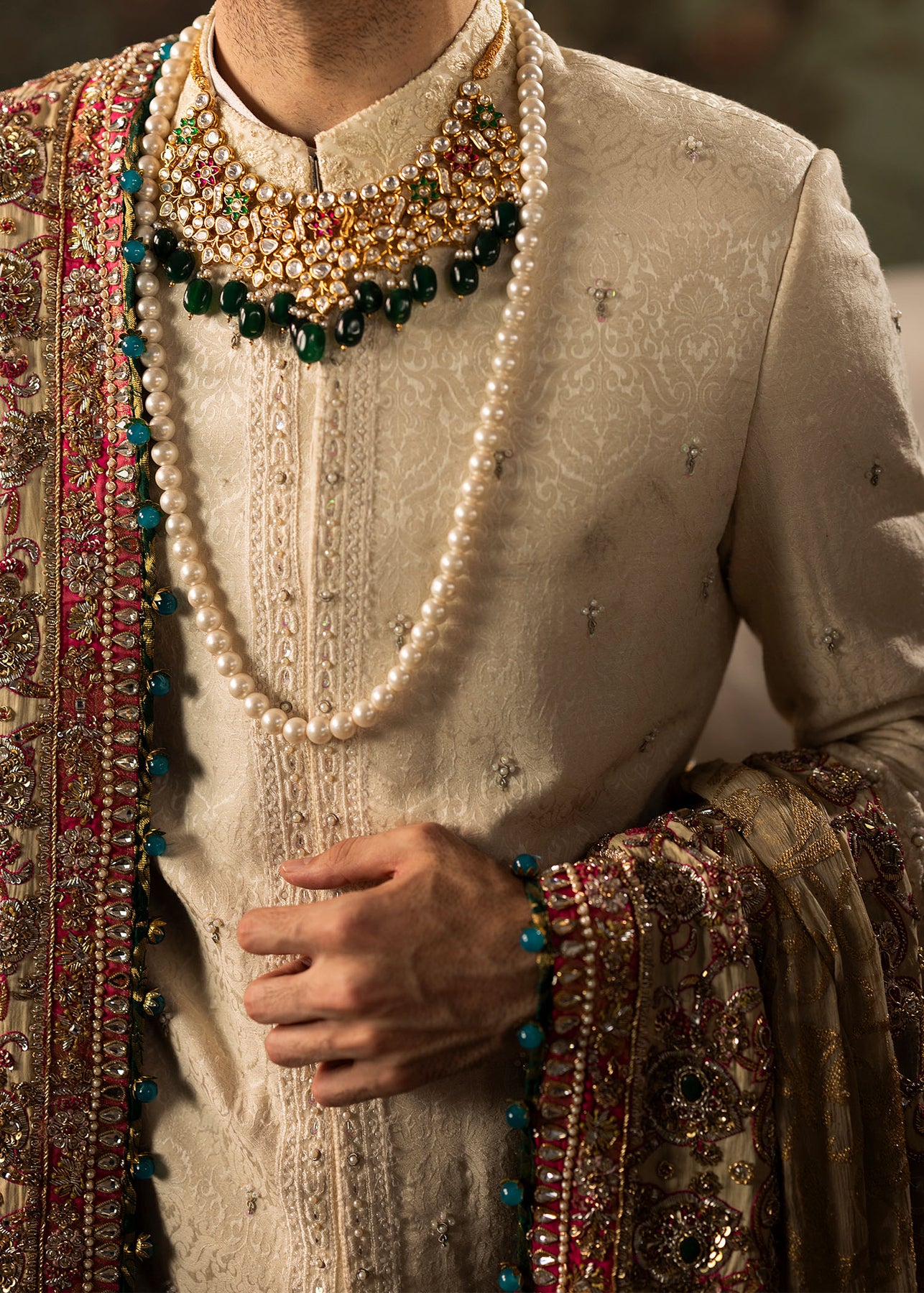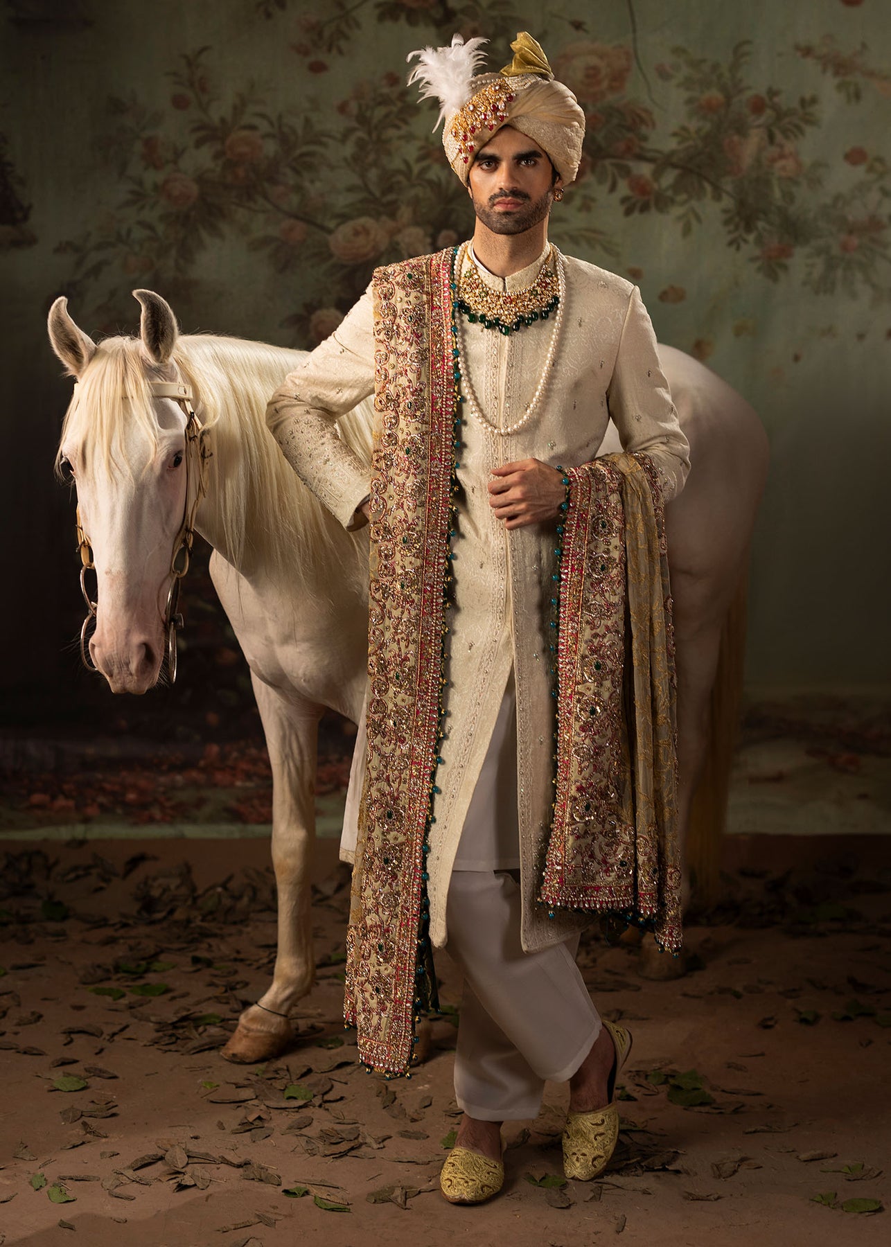 The majestic ivory sherwani is adorned with intricate hand embellishments. It is paired up with a pure raw silk kurta and trouser created by our master artisans with the labour of love. Shawl Dupatta: Draped over shoulder is a heavily embellished dupatta with an ivory beige base and elaborate gold embroidery bordered with motifs, adding grandeur to the overall look. It also features touches of pink and gold for a dramatic contrast.