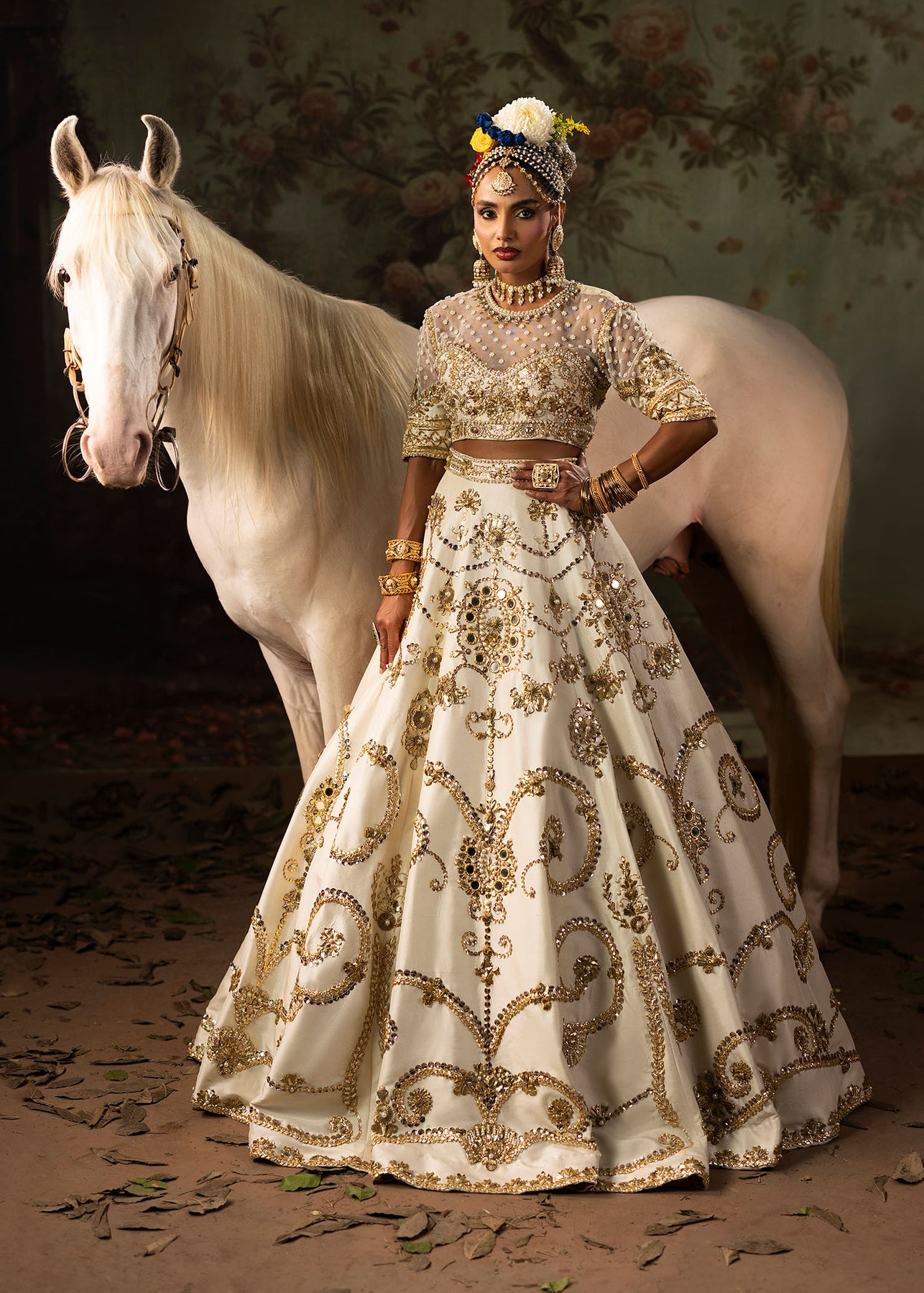 A pristine white raw silk lehenga choli with Classic gota and mirror embellishments delicately paired with pearls for a soft yet regal finish. It consists of a gracefully structured lehenga with a refined choli, embodying timeless elegance. Dupatta is of sheer organza material, richly adorned with gota detailing, completing the look with sophistication and old school charm.