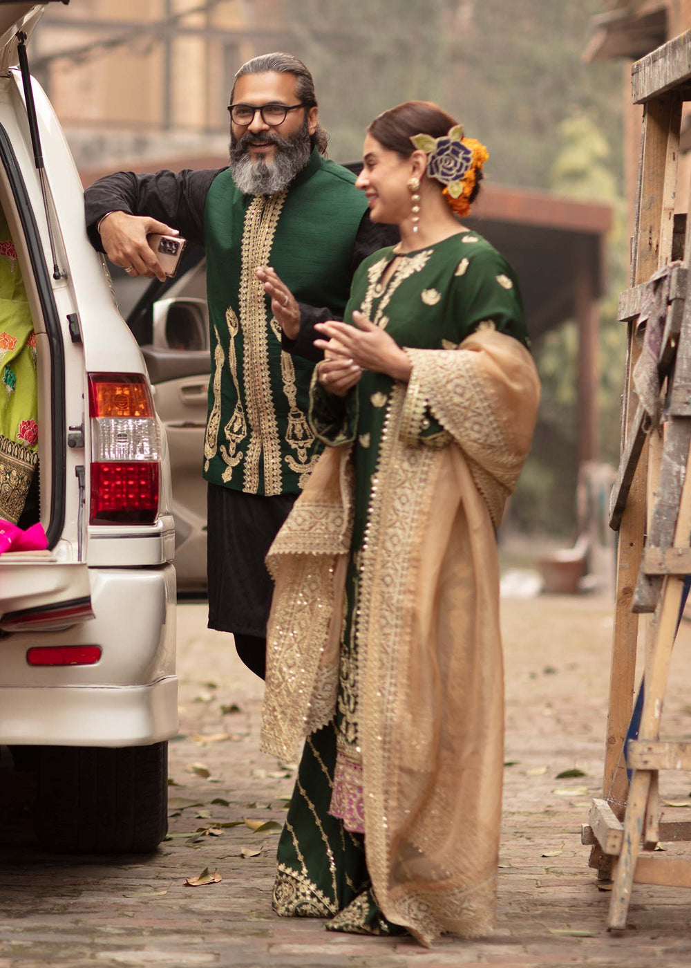 Description: A bottle green silk long shirt and culottes serves as a canvas to gorgeous aari embroidery and sequins work, which is framed with pink embroidered border. It is paired with a champagne organza dupatta with embroidered borders.