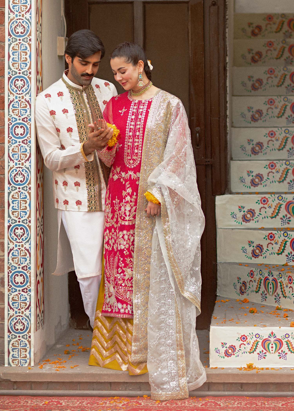 Description: A white cotton silk waistcoat with embroidered florals has gorgeous borders enhanced with sequins work. It is paired up with a luscious white cotton shirt and trousers.