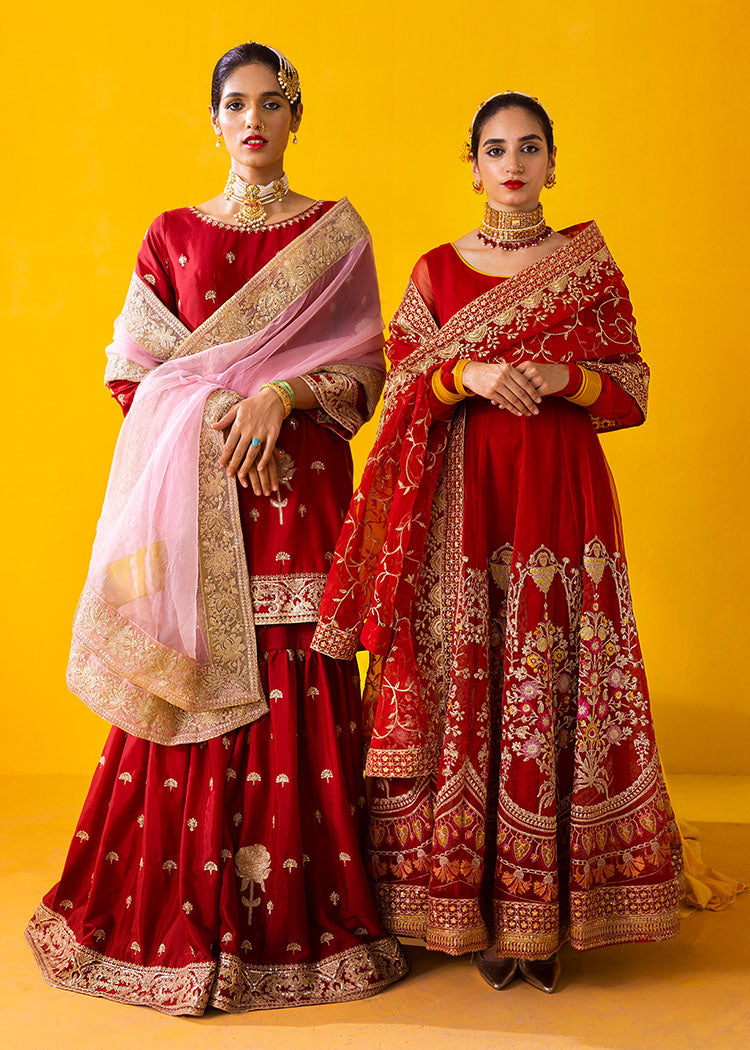 A maroon silk shirt and gharara have beautiful gold aari embroidery and sequins work on it. The shirt has leather tassels and is paired up with a tea-pink organza dupatta with embroidered borders.