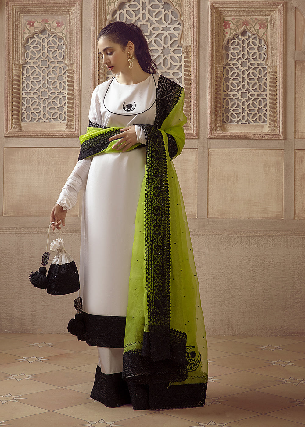 A lucious white silk long shirt has our signature black sequins border and is paired up with white culottes. The Dhani green organza dupatta with embroidery is the star of the show.