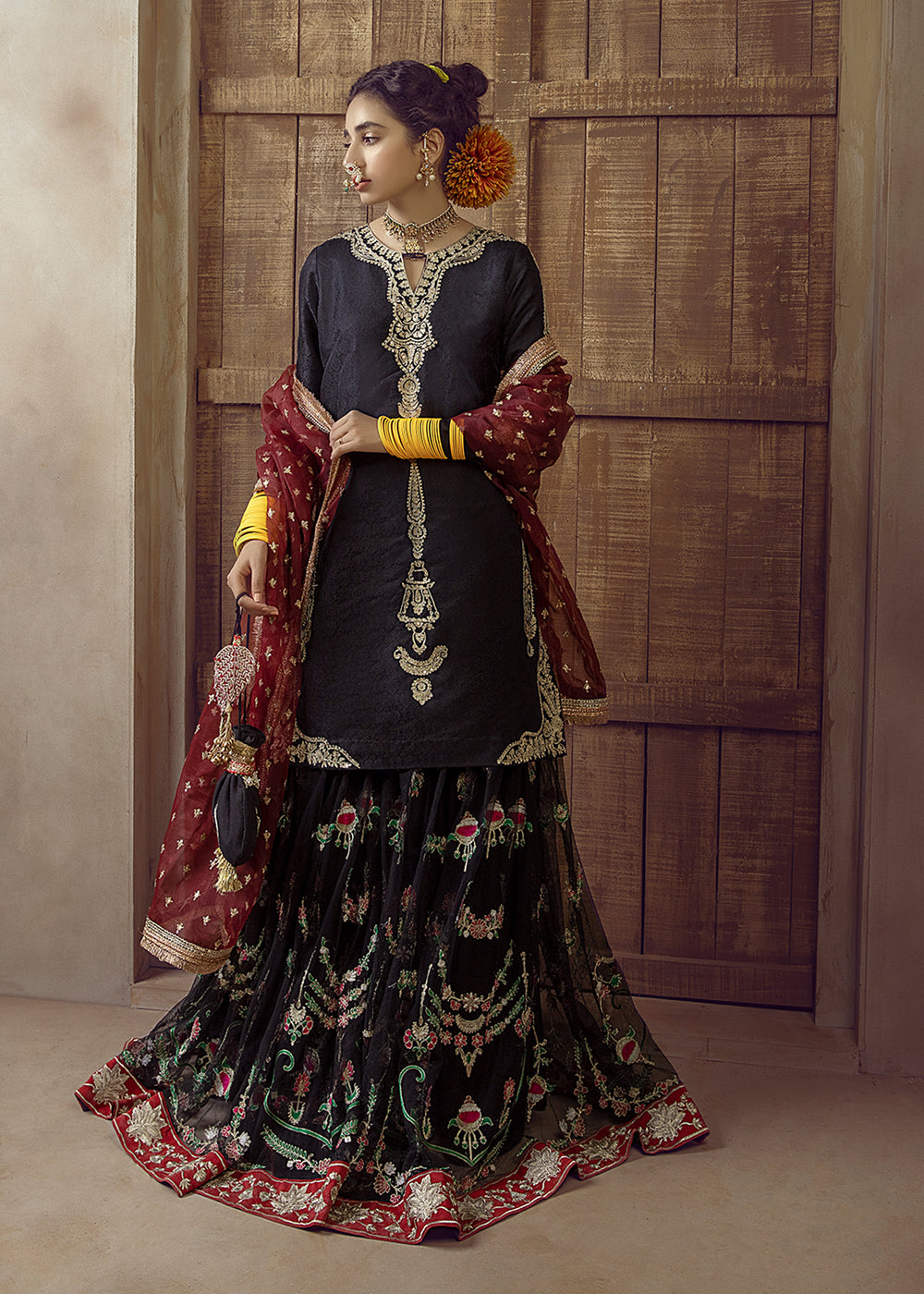 A gorgeous black, self jamawar shirt with aari embroidery and sitara work is paired up with a flaired net embroidered ghrara and an organza dupatta in deep maroon color.