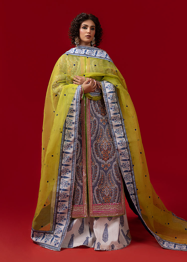 A grey, thoughtfully designed open front, long shirt has gorgeous tilla and resham embroidery on it. It is paired up with a hand-rendered sharara with paisley motifs along with a green organza dupatta.