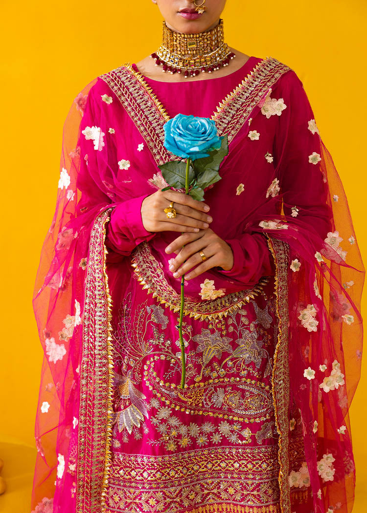 A hot pink cotton net shirt with choridar sleeves and organza gharara have beautiful tilla embroidery and sequins work. It is paired up with a net dupatta adorned with daffodils and framed with embroidered boarders.