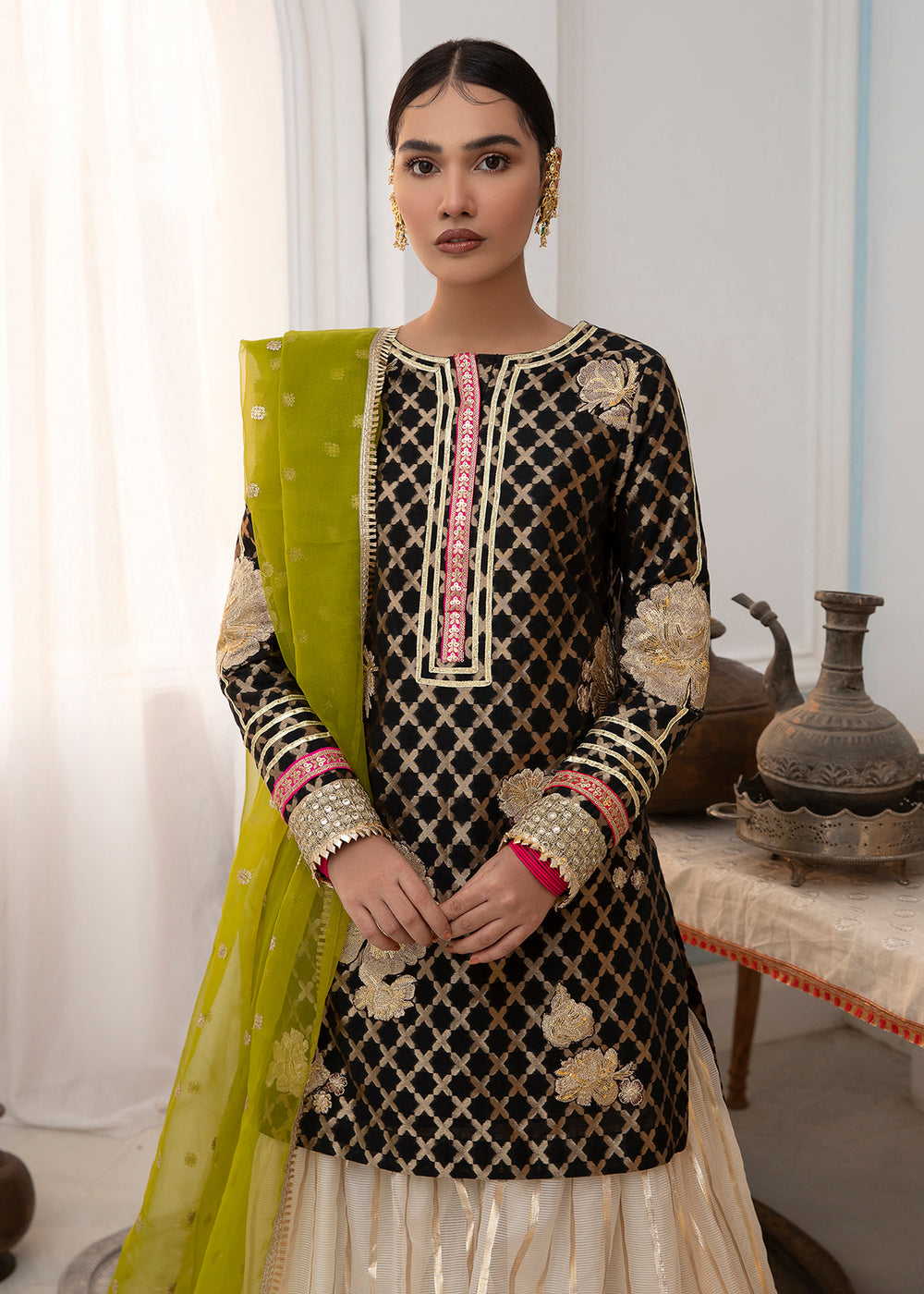 A jacquard shirt is beautifully embroidered with gold florals and the sleeves are enhanced with embroidery and gota pati. It is paired up with a ghrara in self organza framed with zari borders, along with a dhani green organza duptta with botis (motifs) and kiran border.