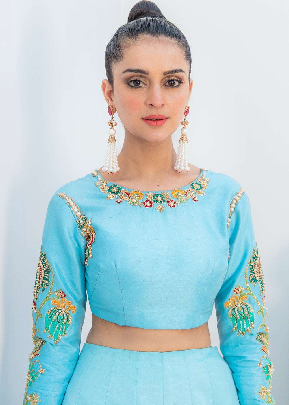 Keep it simple and chic. A powder blue raw silk lehenga is a millennial favourite. Sparkling resham embroidery on the sleeves match the blouse perfectly. Plain drape adds a modern touch to the outfit.