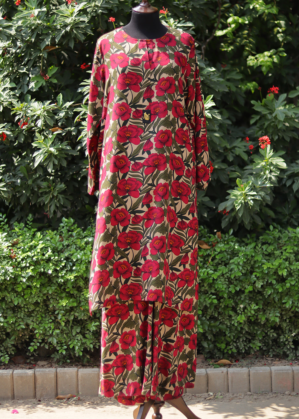 An easy breezy, super comfortable beige tunic is made out of linen and is beautifully hand-rendered like a bed of hot pink Roses. It is paired up with a white shalwar and is perfect for staying in or chilling out!