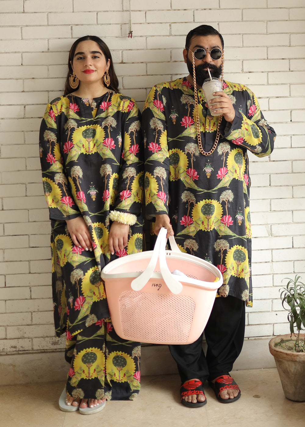A super quirky, easy breezy, black tunic is made out of linen to keep you comfortable while chilling out. It is hand-rendered with our signature Mithus (Parrots) and a gorgeous botanical print in bright yellow and pink. This piece is paired up with a luscious black shalwar.