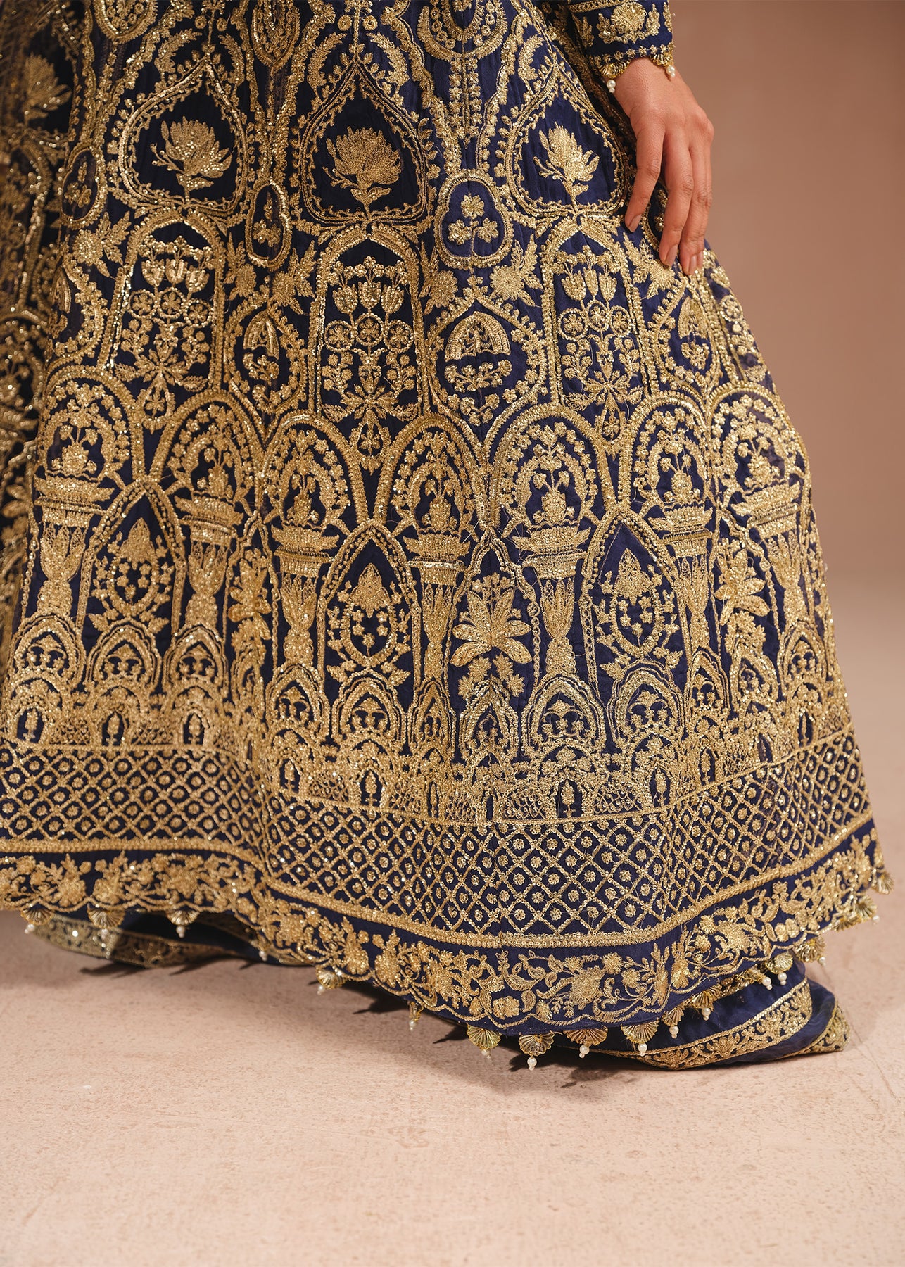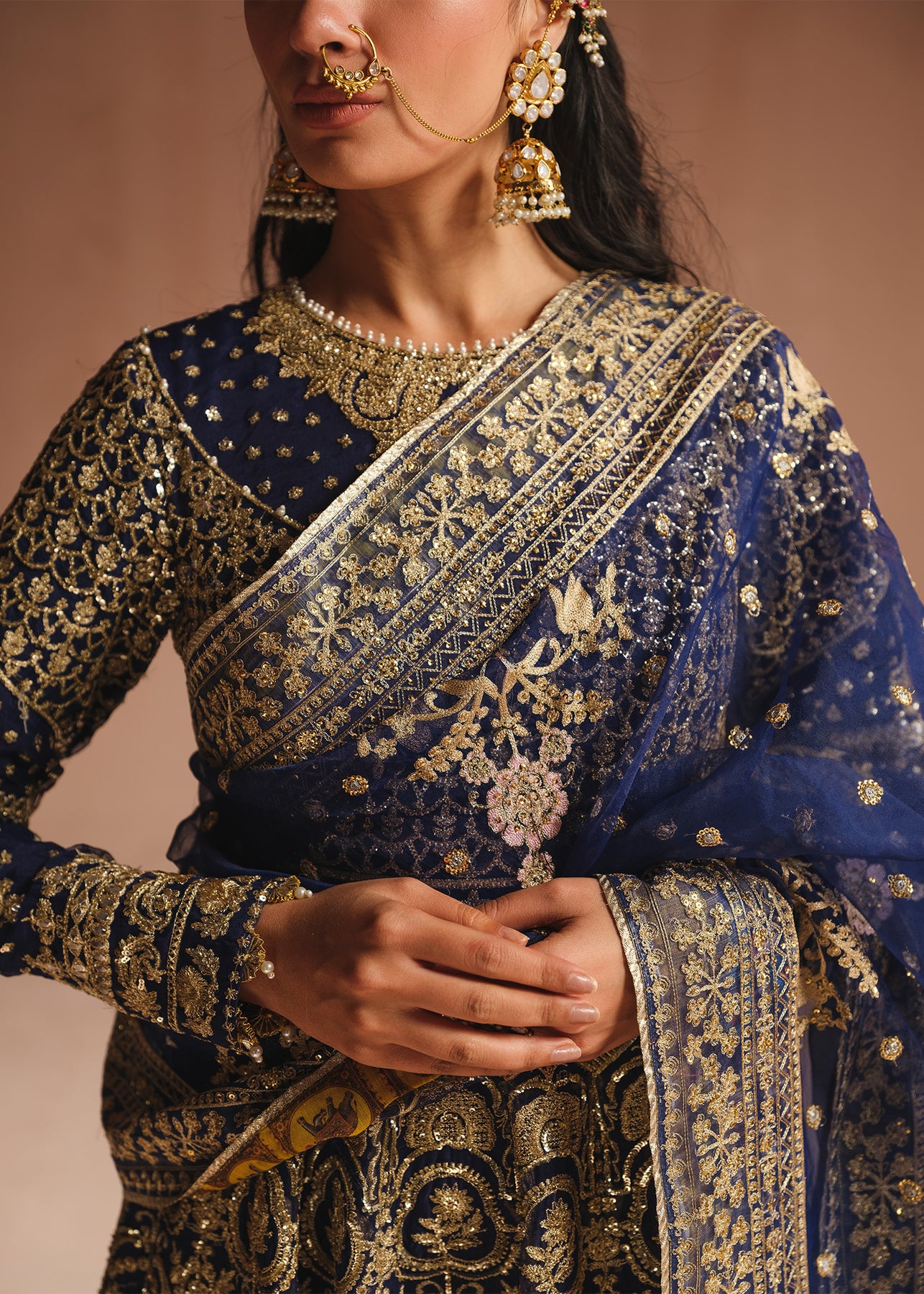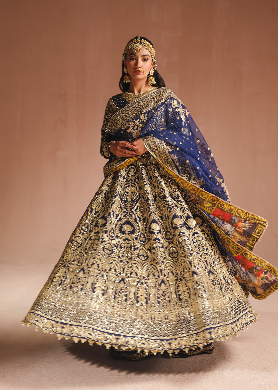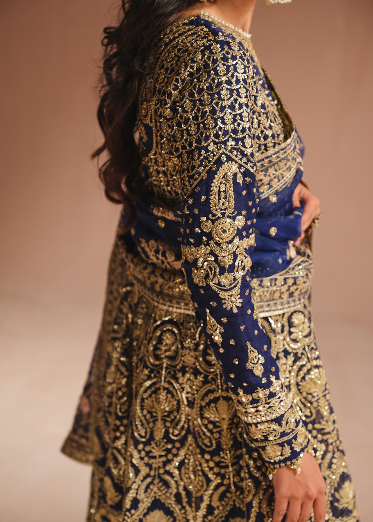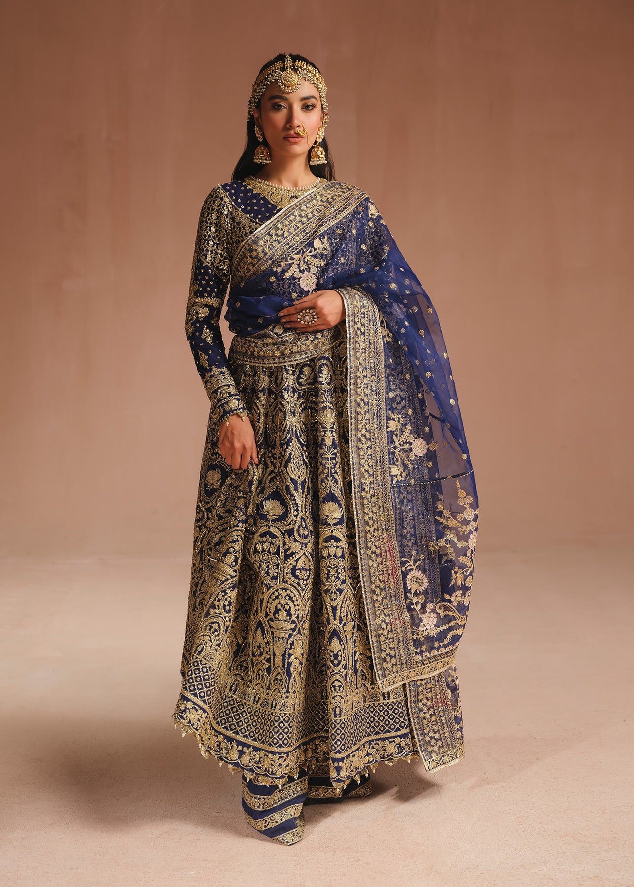 An exquisite navy blue pishwas is adorned with opulent gold embroidery, intricate tilla, and dazzling sequins. The jewel neckline and embroidered border adds a touch of regal elegance. Complementing the ensemble is a trouser and a stunning organza dupatta featuring a beautifully embroidered border on all sides and baby pink florals blooming all over.