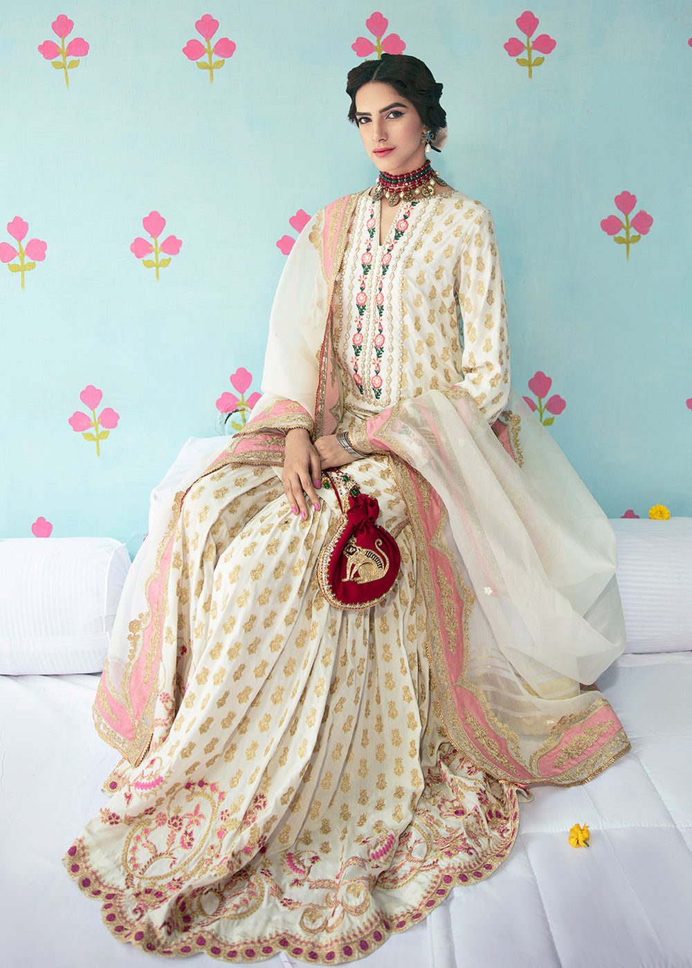 A cotton silk shirt and gharara is enhanced with gorgeous golden aari embroidery all over it. The ghrara has a beautiful scalloped border while the organza dupatta has tea pink finishing on all sides.