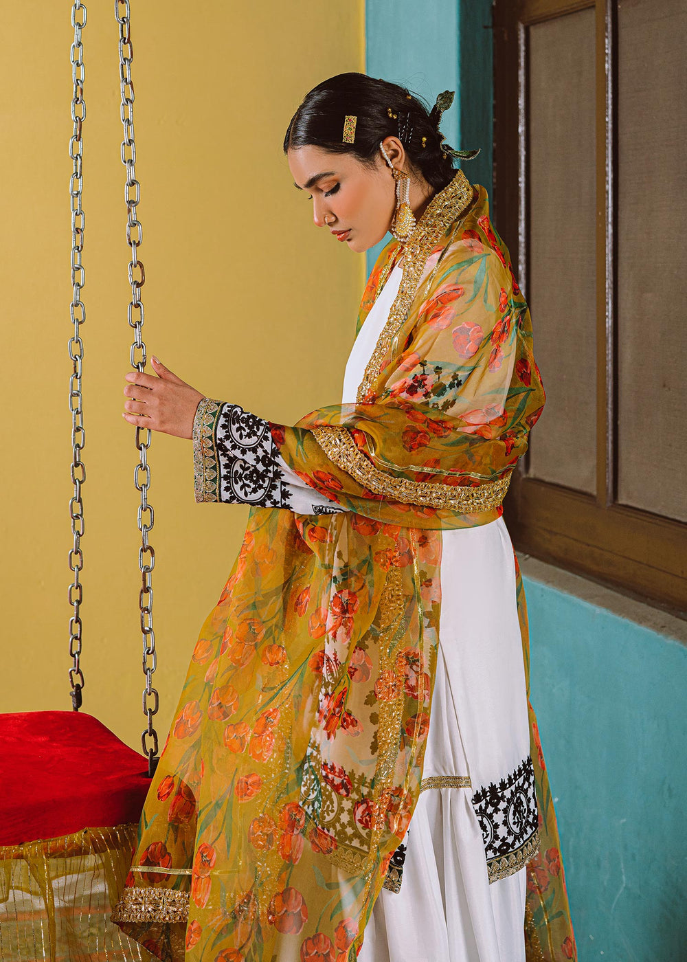 Description: A luscious white silk shirt and ghrara have gorgeous black aari embroidery which is enhanced with black sequins. It is paired up with an hand-rendered, organza dupata which is framed with gotta borders.