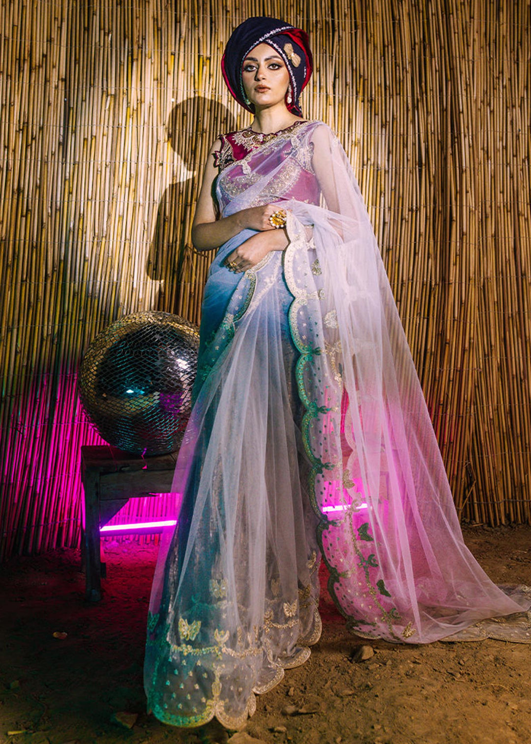 This silver-grey net saree is hand embellished with adda work with silver PK tissue scalloped finishing and comes with a silver sequin fabric petti coat and a shocking pink raw silk blouse worked with embroidery.