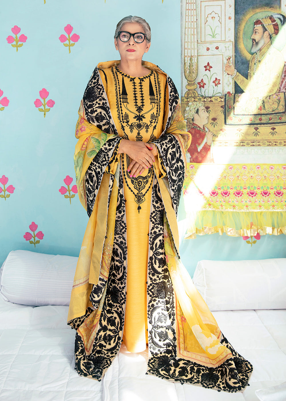 A rich cotton net base in spellbinding mustard hues serves as a canvas to gorgeous black embroidery. The midcalf length shirt has a loose silhouette and is paired up with a trouser and hand-rendered organza dupatta.