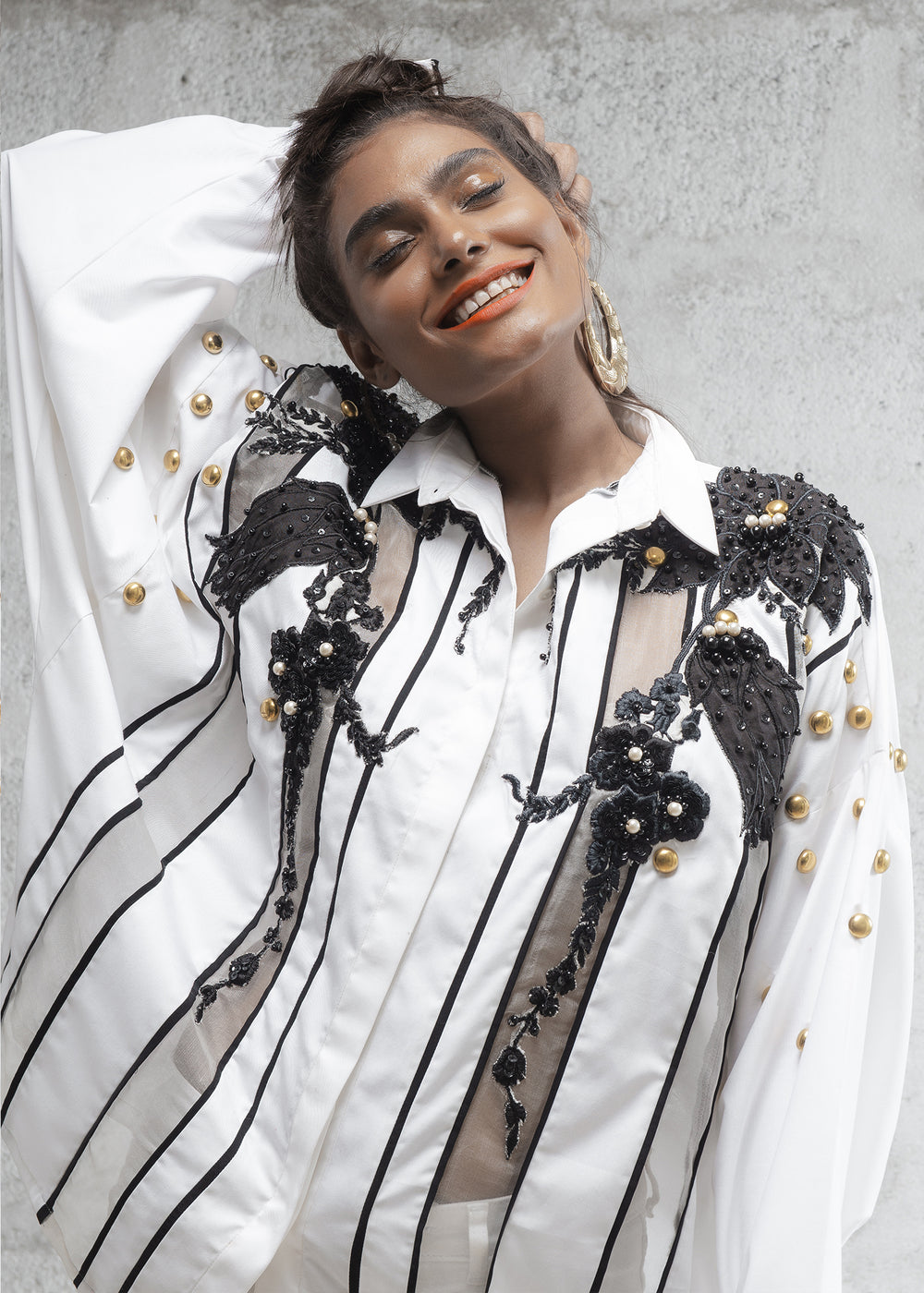 White cotton button down with pure french organza details. Black heavily embellished flowers and metallic studs.