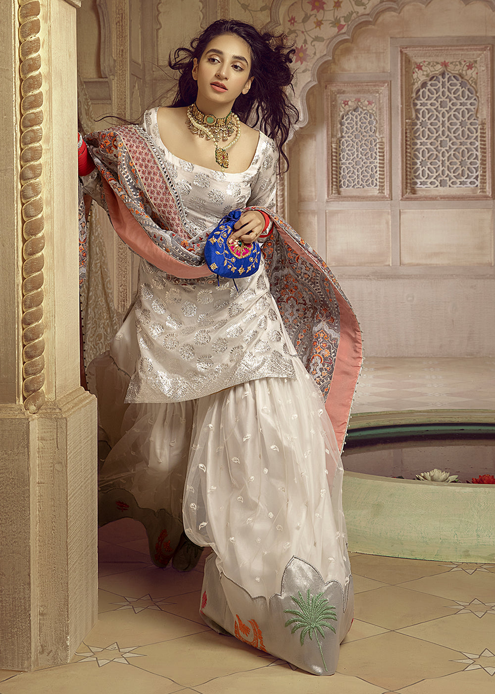 A gorgeous organza shirt with zari work is paired up with an embroidered net ghrara which is enhanced with tissue details and embroidered motifs. The heavily embroidered organza dupatta is a beautful grey shade is the star of the show.