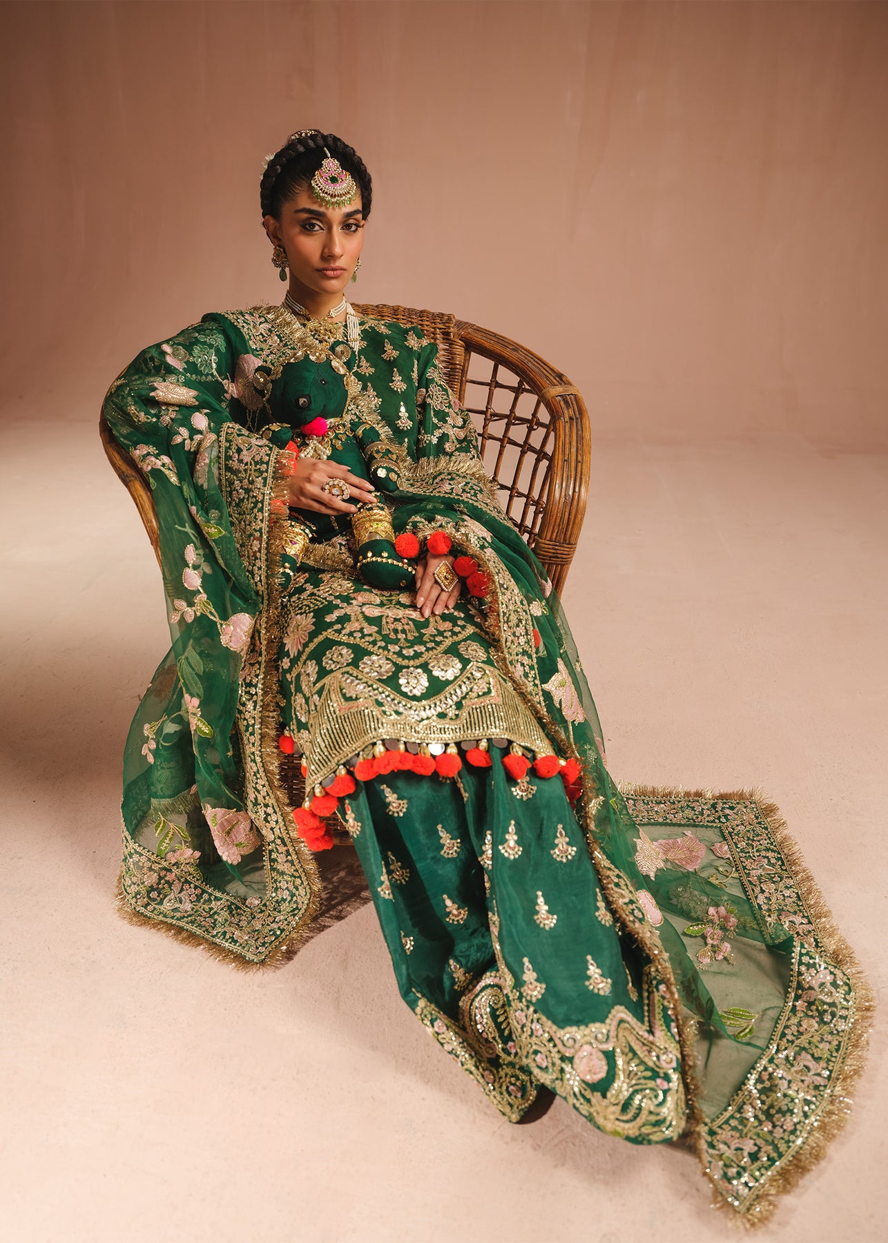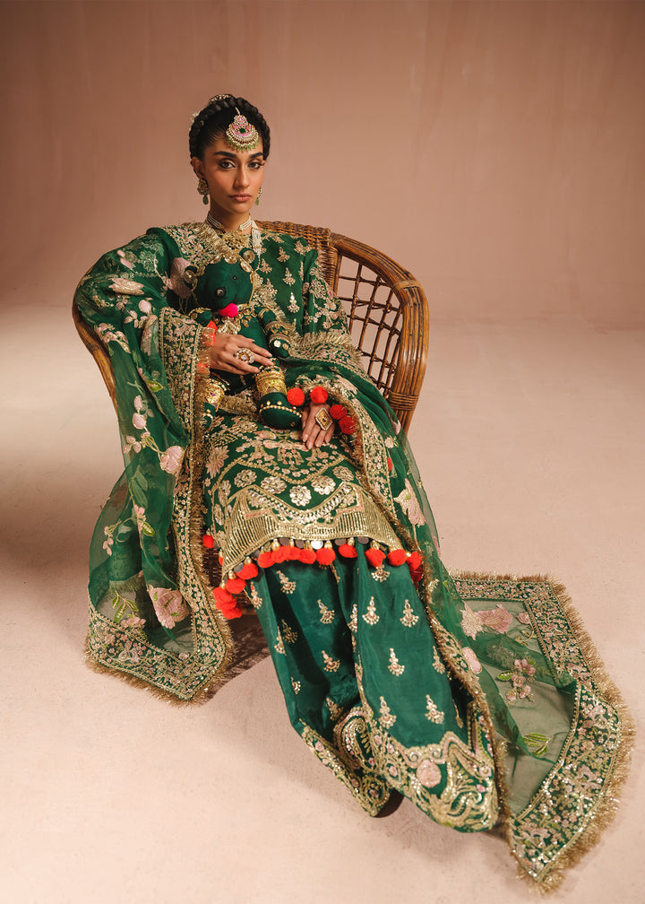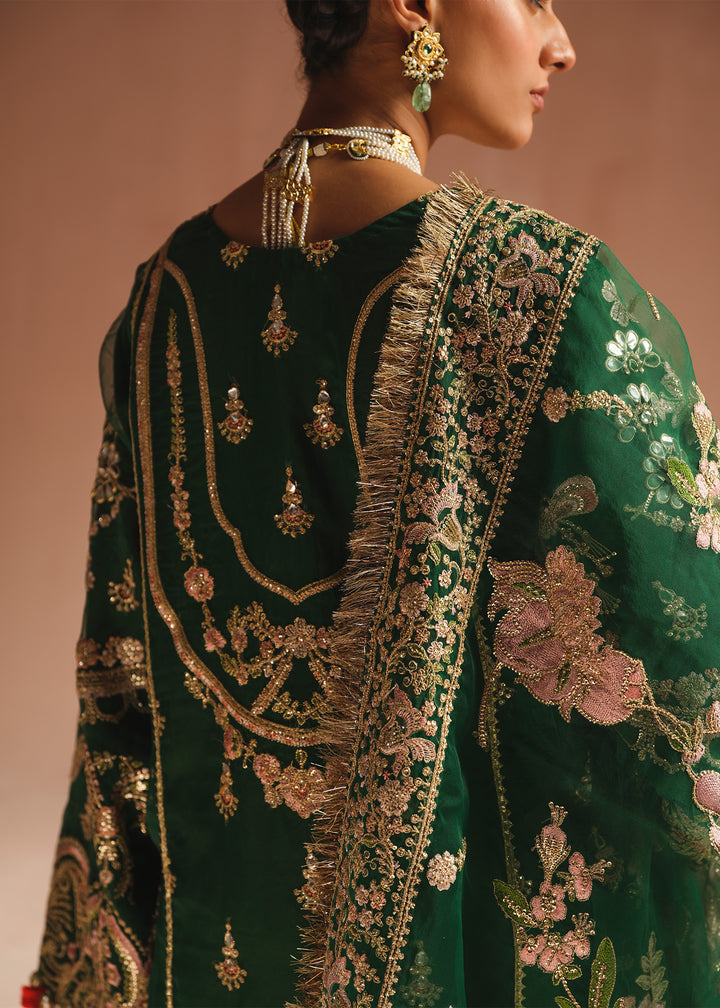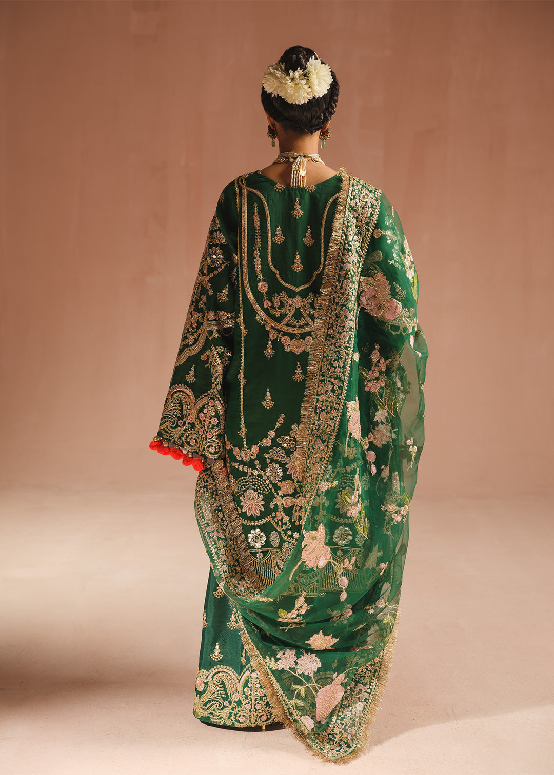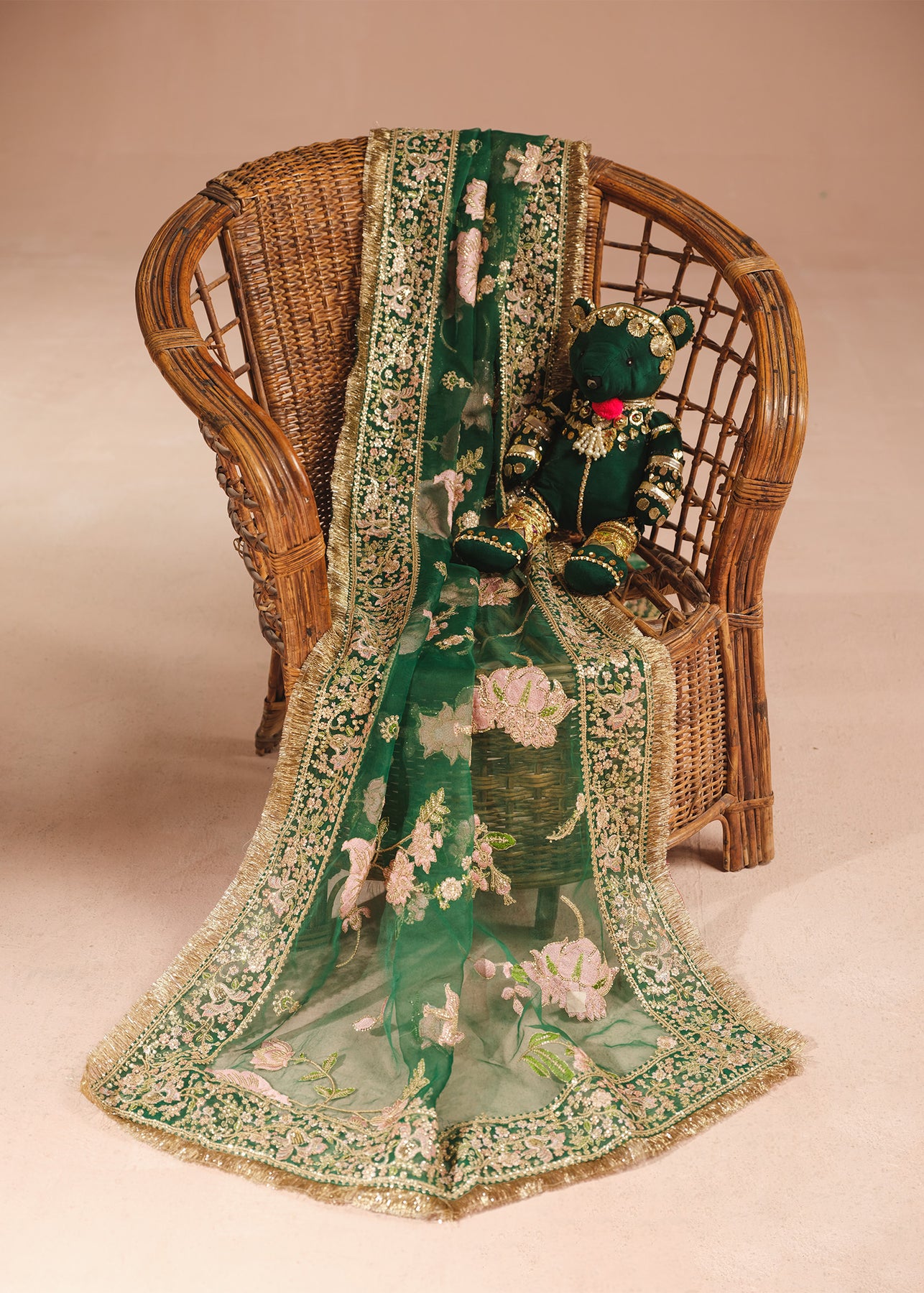 An exquisite emerald green organza shirt and shalwar is adorned with intricate gold tilla, dazzling sequins and panni work. Complementing the ensemble is a lovely green embroidered dupatta with baby pink floral blooming all over dupatta and framed with a border.
